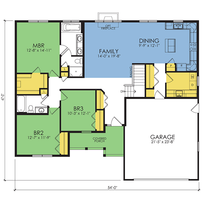 A part of our Wausau Originals, the Barton floor plan features 3 bedrooms and 2 bathrooms with a foot print of 54x47 feet and 1668 total square feet of living space. Floor Plan #WO232