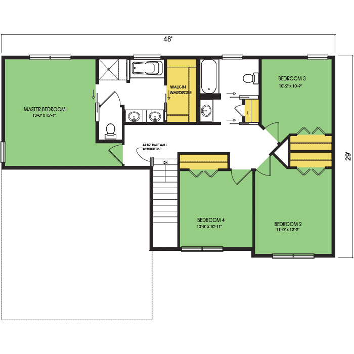 A part of our dream series, the tamarack floor plan features 3 bedrooms and 1.5 bathrooms with a foot print of 44x30 feet and 1342 total square feet of living space.