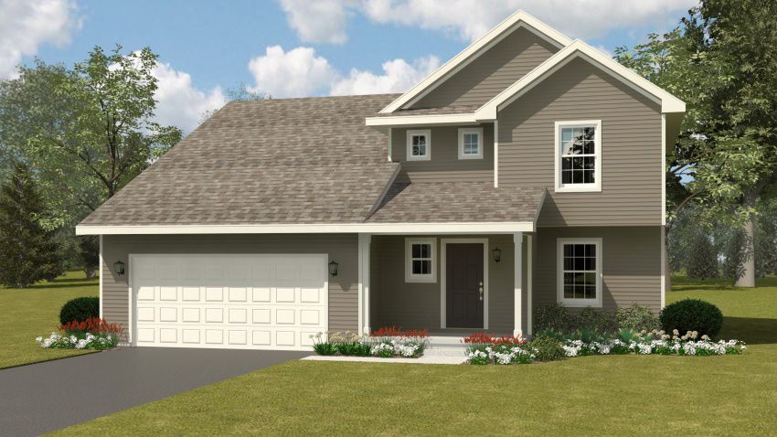 Exterior rendering of Quaking Aspen floor plan from the front. European exterior style. 3 bed/2.5 bath. European