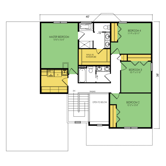 A part of our designer serie, the whispering lakes floor plan features 4 bedrooms and 2.5 bathrooms with a foot print of 52x49 feet and 2611 total square feet of living space. Floor Plan #DN218